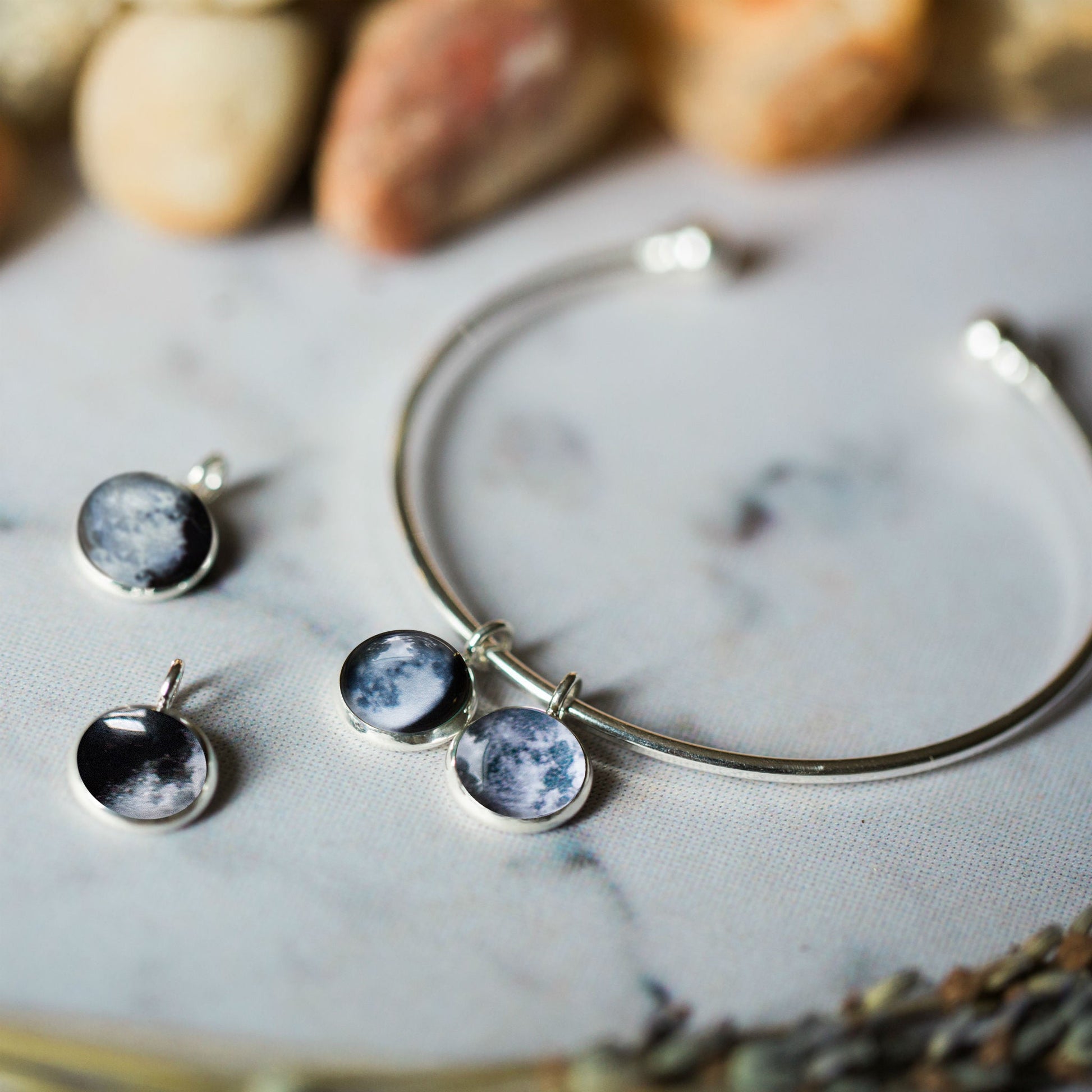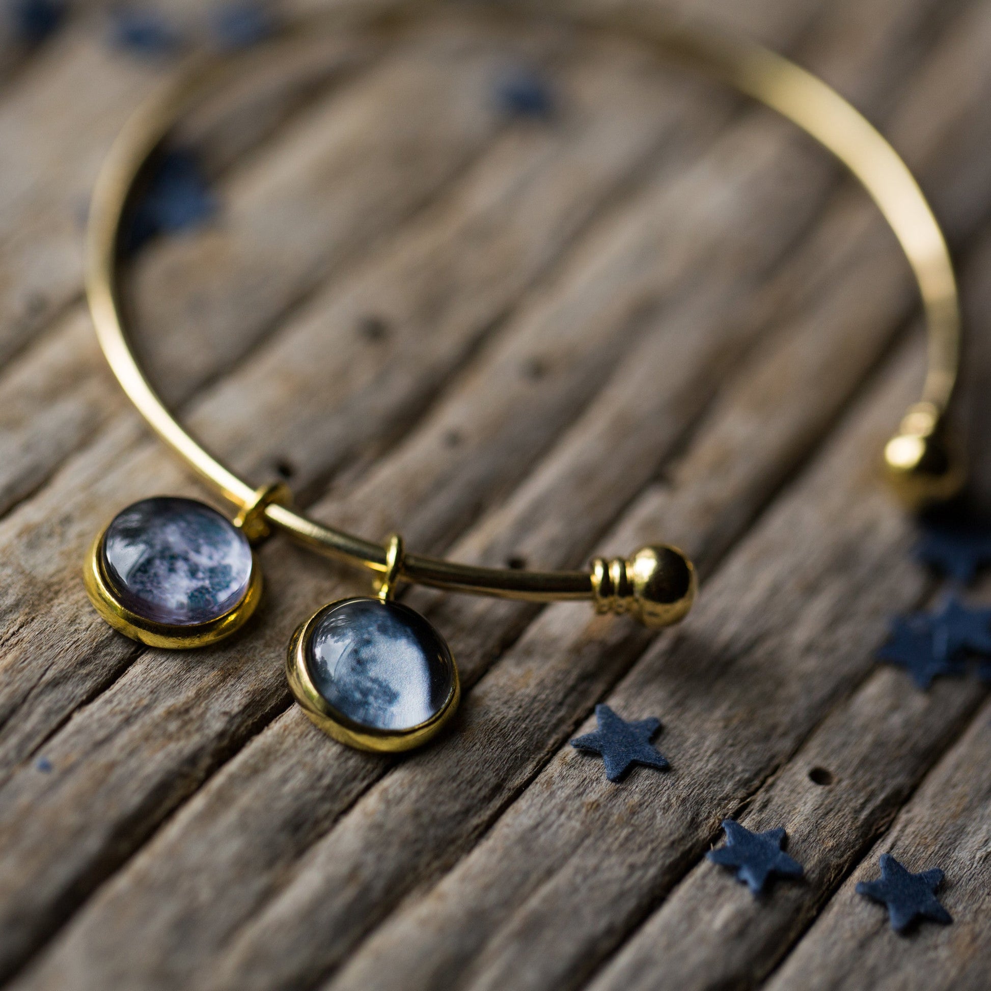 Personalized, sentimental, and out of this world! This charm bracelet is a great gift, and one that you can build on for years to come. Available in silver or gold tone, we look up the Moon from the date you provide and set it in a charm to dangle on this delicate cuff. And this design is perfect to celebrate as many dates as you like! P erhaps you and your spouse's birthdates, the day of your wedding, the birthdays of your children, as a BFF gift with your favorite person, the options are limitless. If you need more than 5 Moon s on your bracelet, please to set up a personalized listing for you.