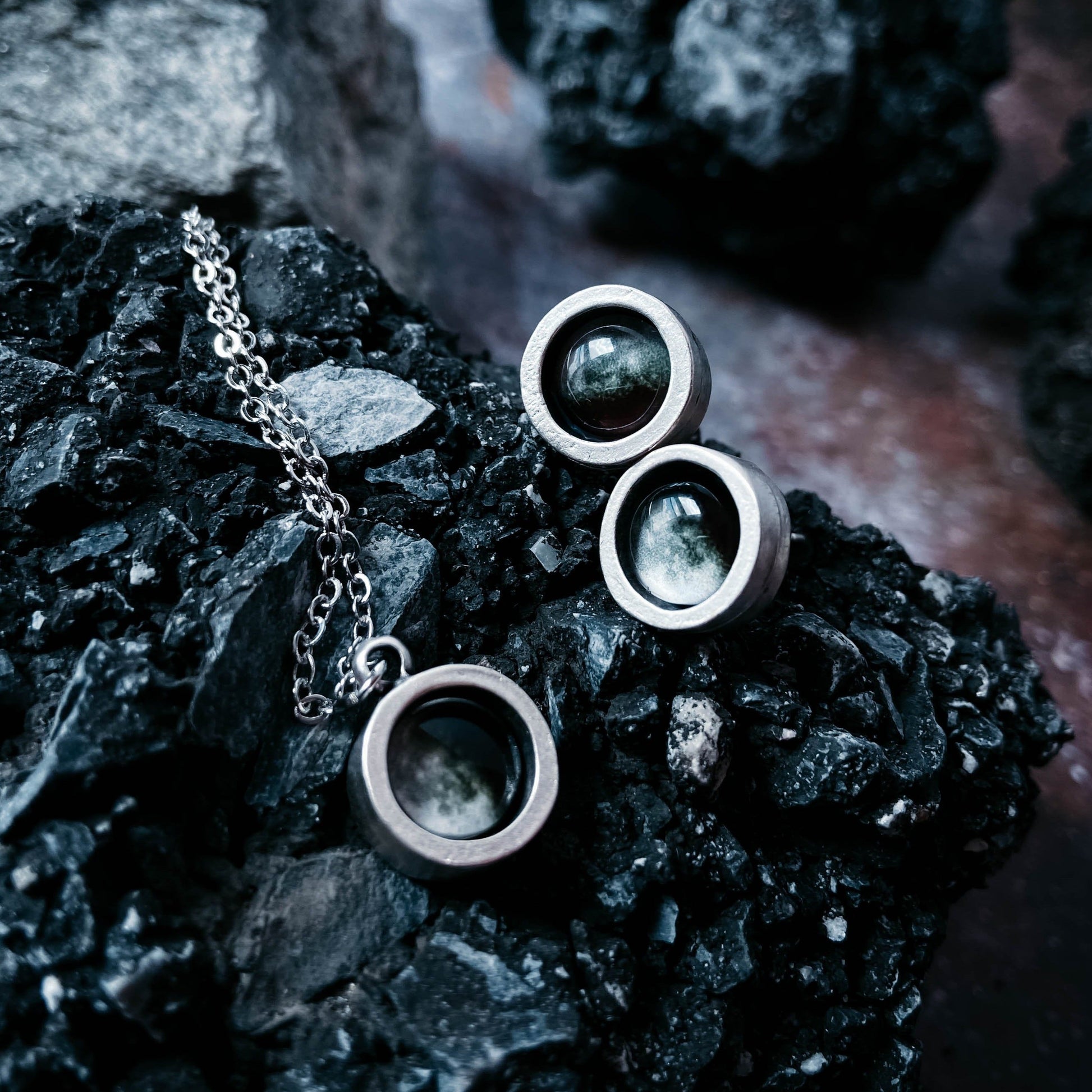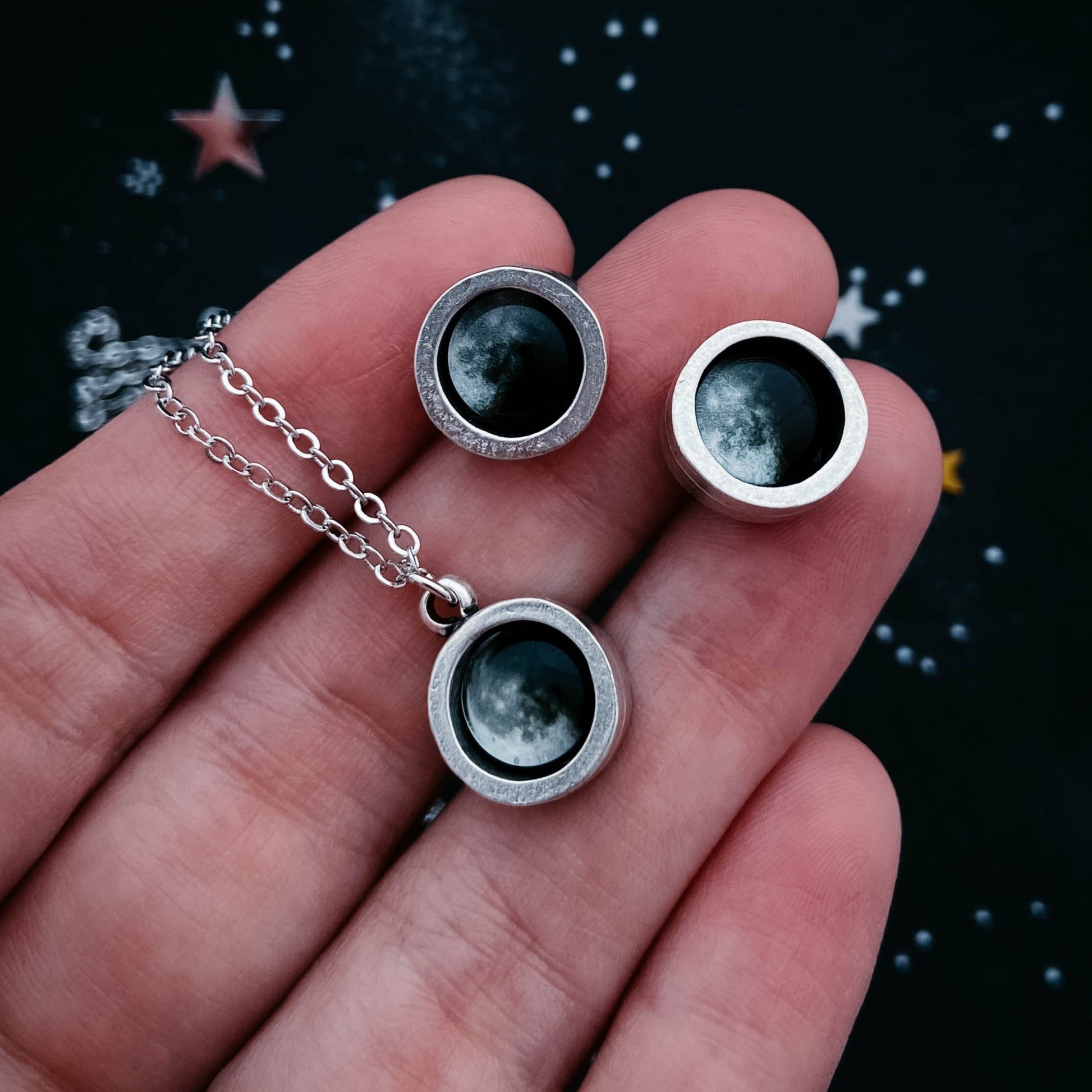 This jewelry set comes with a custom made pair of earrings and a necklace featuring the phase(s) of the Moon from the date of your choosing! Whether you wish to commemorate a personal achievement or help someone else celebrate a special moment, we help find the phase of the Moon shining at that time and turn it into a timeless keepsake. You can have all 3 pieces match with the same Moon, or you can mix them all up and celebrate a lot all at once! The choice is entirely up to you. This set was designed to be a go-to staple in any jewelry rotation and makes the perfect gift.