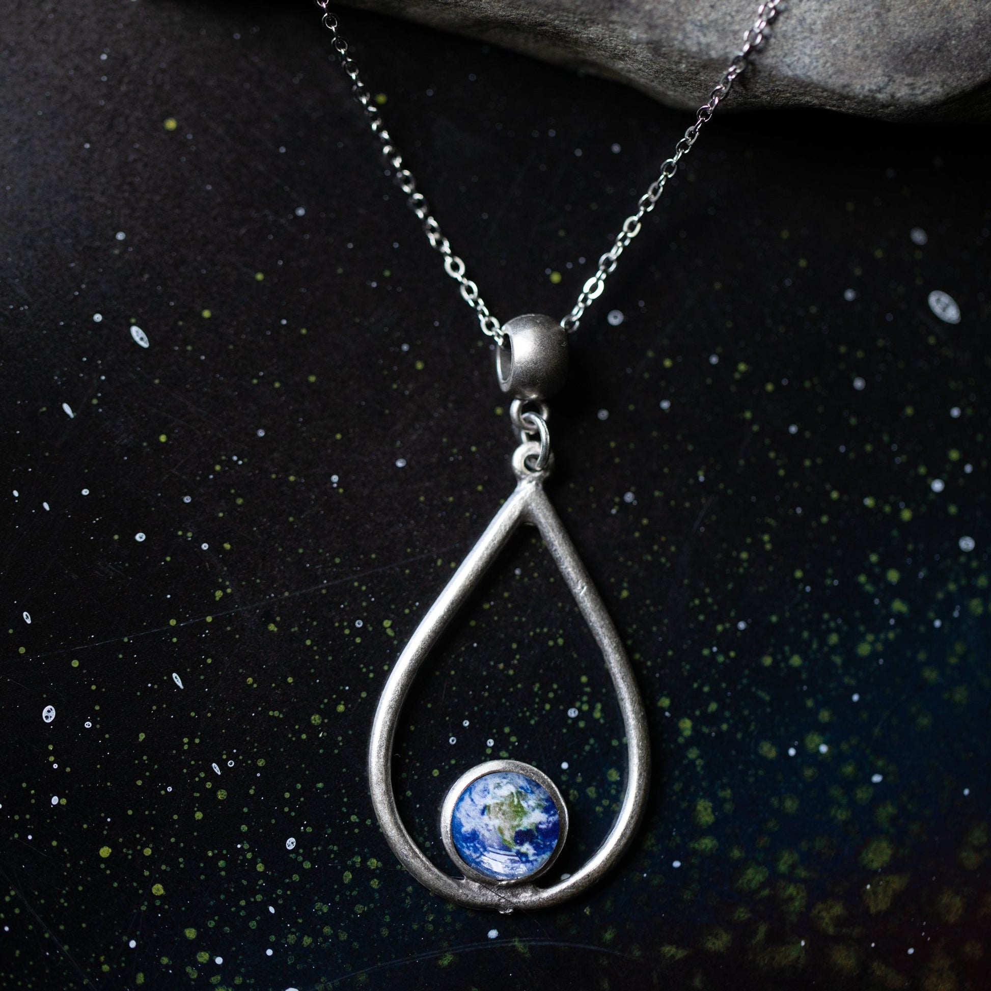 Simple yet a statement, this brushed silver tone teardrop style pendant holds a small bit of space of your choosing. You read that right! Customize your very own celestial necklace with a bit of the cosmos from our available selections. Whether you want to feature a planet, star, moon, or nebula, the options are vast. Makes a great thoughtful gift for bridesmaids, teachers, astronomy lovers, stargazers, and anyone who loves to think about our place in the Universe.